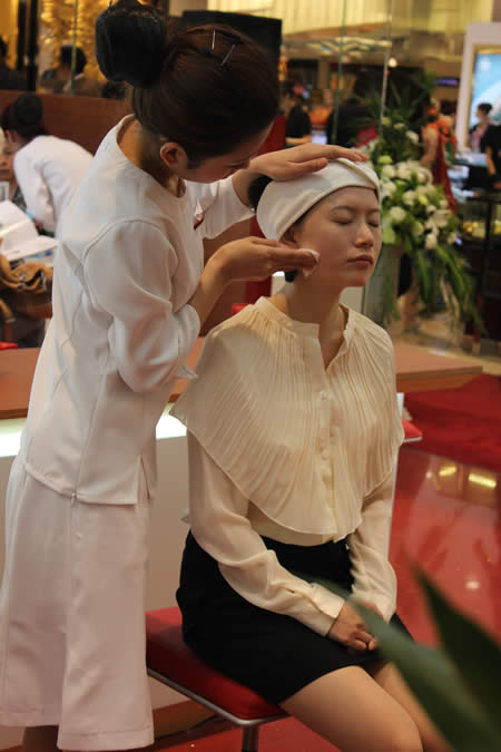 嬌韻詩(shī)專(zhuān)柜導(dǎo)購(gòu)用專(zhuān)業(yè)手法為顧客現(xiàn)場(chǎng)做植物精華護(hù)理